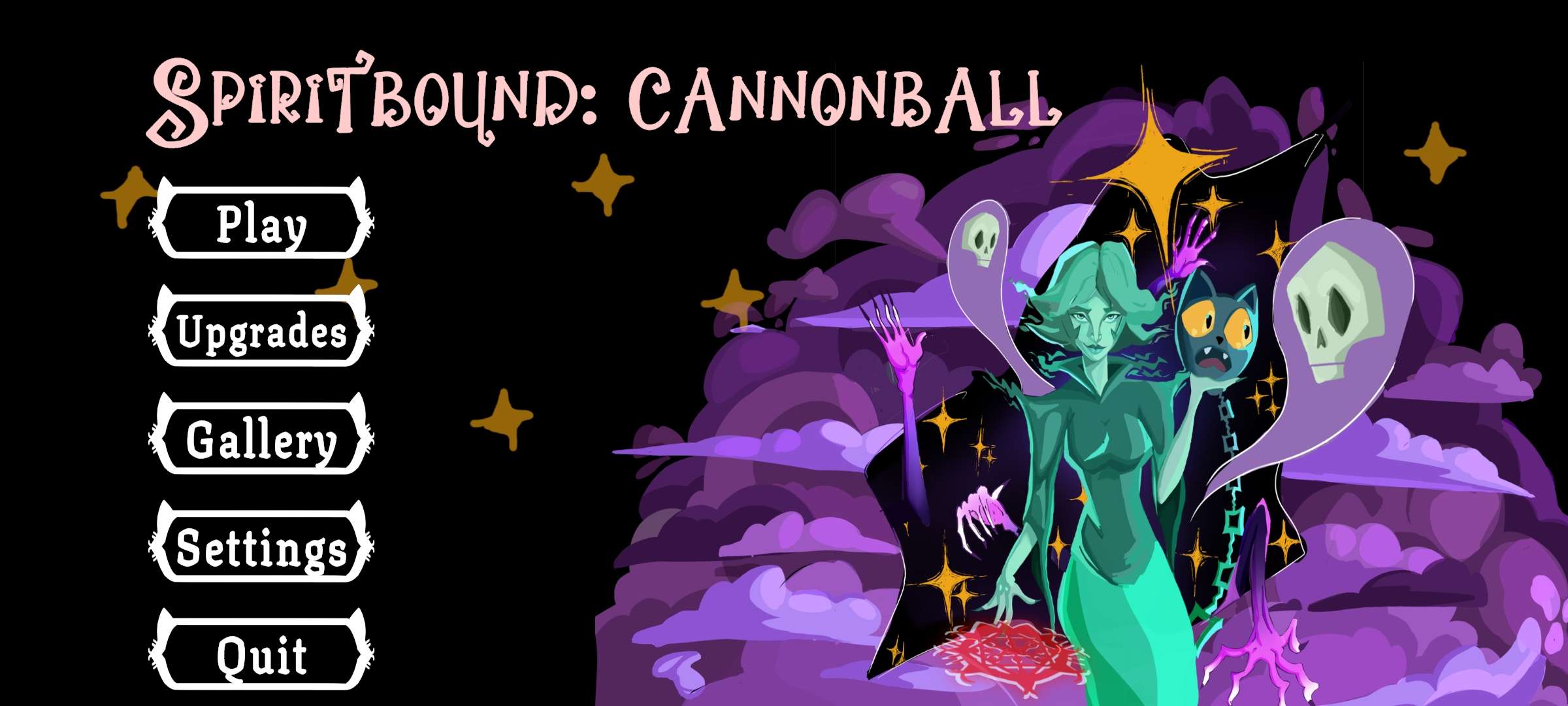 A ritual gone wrong has bound a witch’s spirit to her cat familiar. Finding themselves stuck in Limbo - a shifting realm containing lost souls - they must work together to find a way out. In Spiritbound: Cannonball, you’ll help this duo through various hazards in Limbo, recover lost memories, and cannonball yourself back to the mortal world.